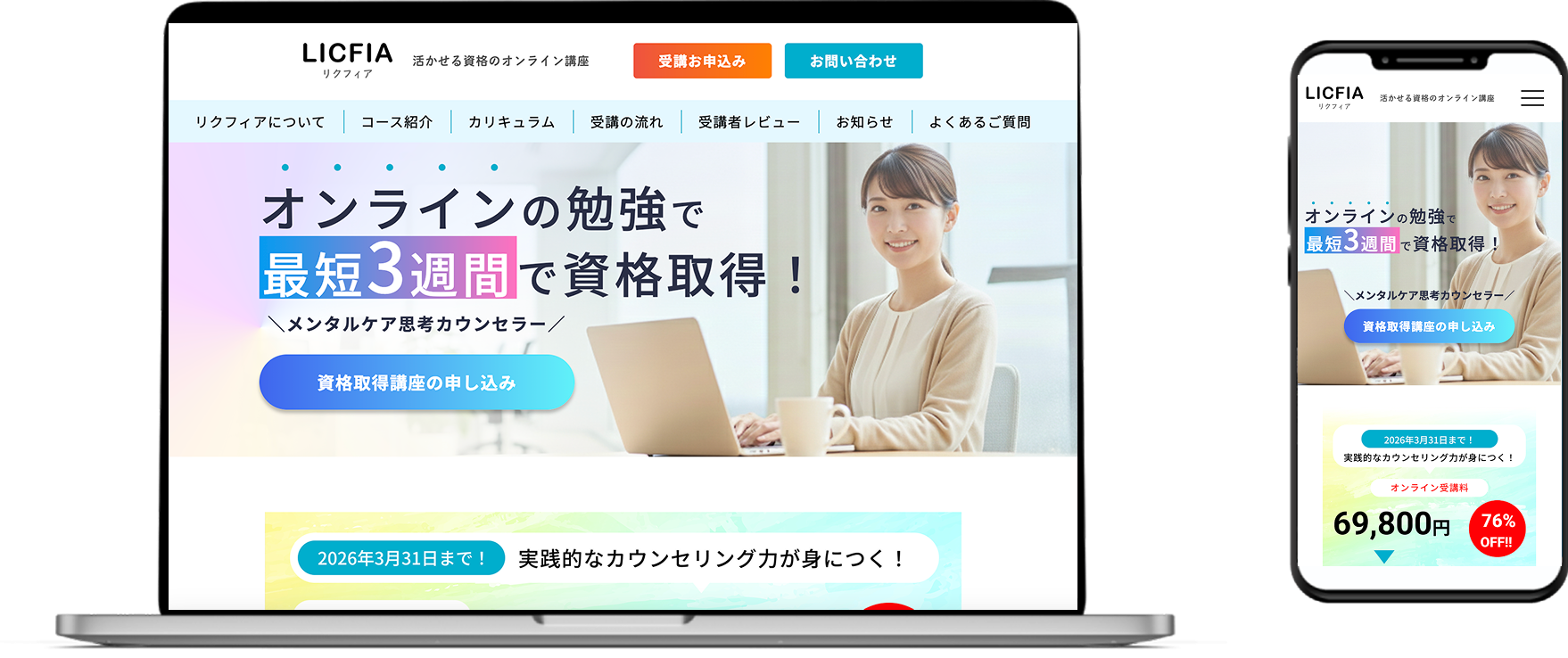 資格のリクフィアはエムクアが運営をする資格試験合格の為の学習プラットフォームです。新しいビジネスの立ち上げに伴うWEBサイト制作をインハウスで行いました。