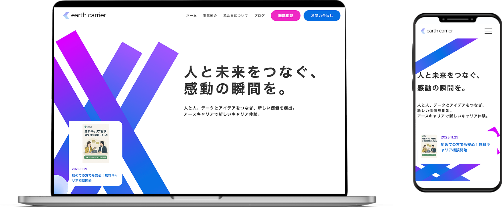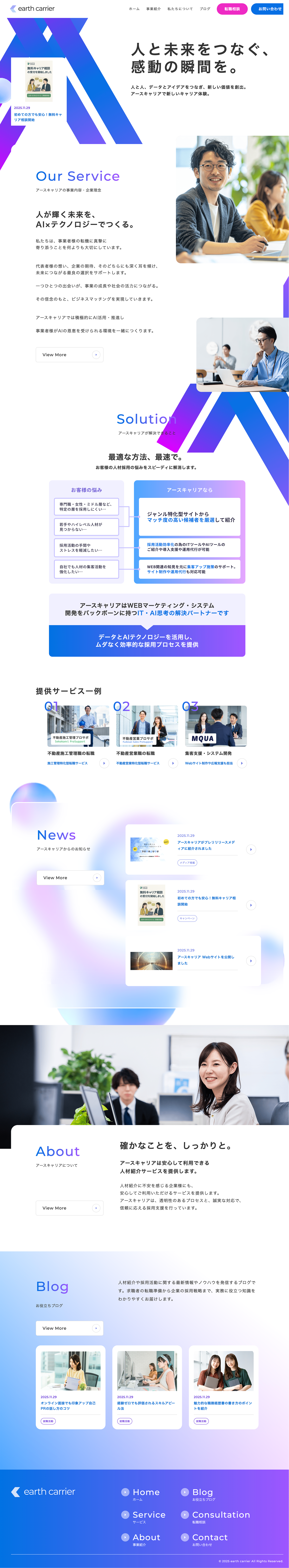 アースキャリアはエムクアが運営をする人材紹介エージェントサービスです。新しいビジネスの立ち上げに伴うWEBサイト制作をインハウスで行いました。